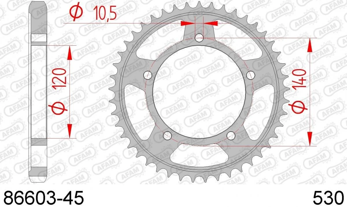 Een stalen 45 tands AFAM achtertandwiel. De tandwielen van AFAM zijn gemaakt van C45 staal met inductie geharde tanden, het tandprofiel is concentrisch, plat en perfect rond. Door deze samenstelling zijn de AFAM tandwielen perfect ter vervanging of zelfs ter verbetering van de OEM tandwielen.