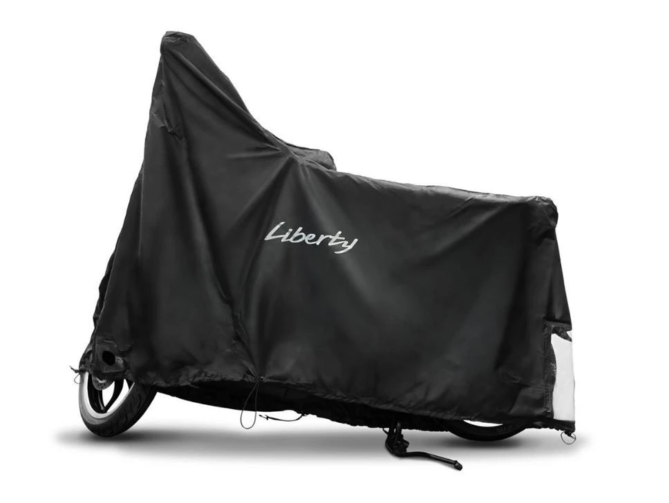 Beschermhoes met openingen voor accessoires. Kleur zwart met reflector strip, transparante kentekenplaat venster. Voorzien van het Piaggio logo.